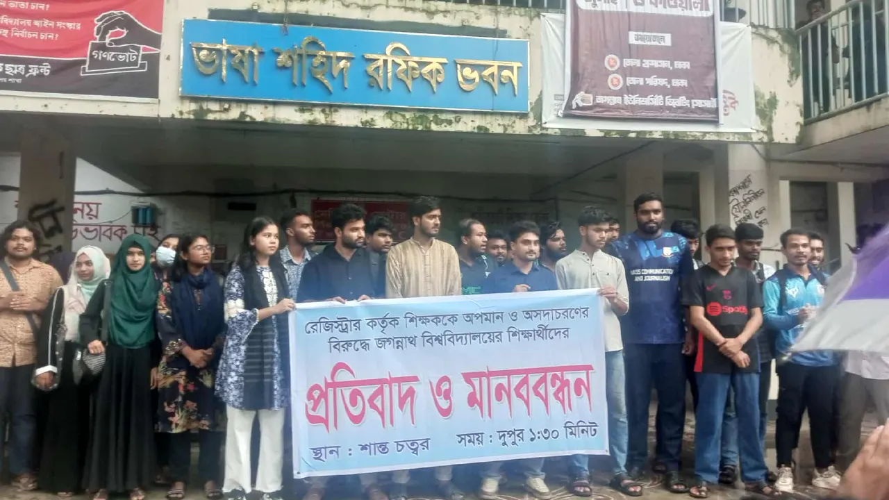জবিতে শিক্ষককে অপমানের অভিযোগে রেজিস্ট্রারের  বিরুদ্ধে মানববন্ধন