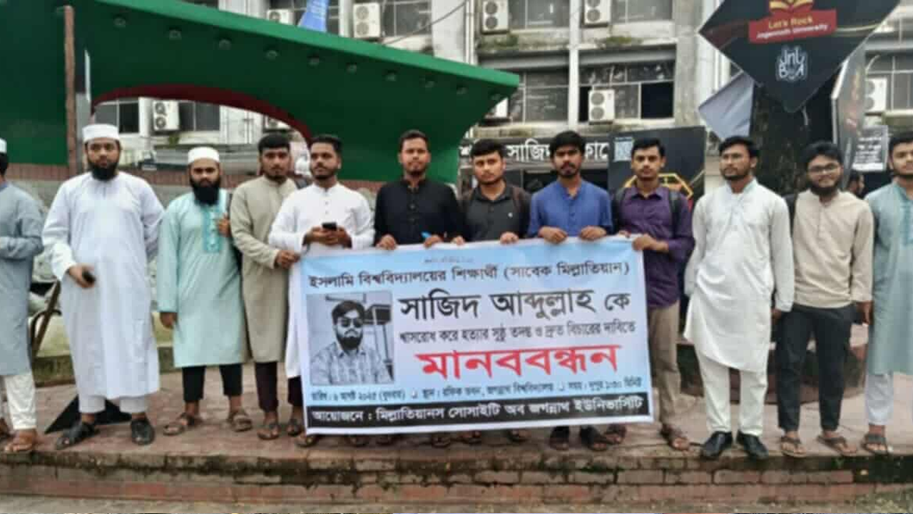 ইসলামী বিশ্ববিদ্যালয়ের (ইবি) শিক্ষার্থী সাজিদ আব্দুল্লাহকে (সাবেক মিল্লাতিয়ান) শ্বাসরোধ করে হত্যার সুষ্ঠু তদন্ত ও দ্রুত বিচারের দাবিতে মানববন্ধন করেছে মিল্লাতিয়ানস সোসাইটি অব জগন্নাথ ইউনিভার্সিটির শিক্ষার্থীরা।